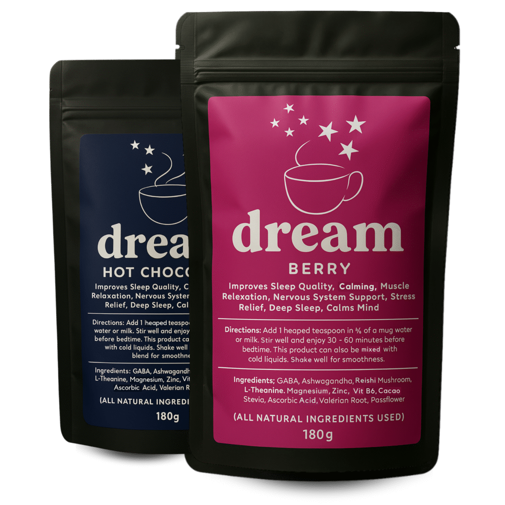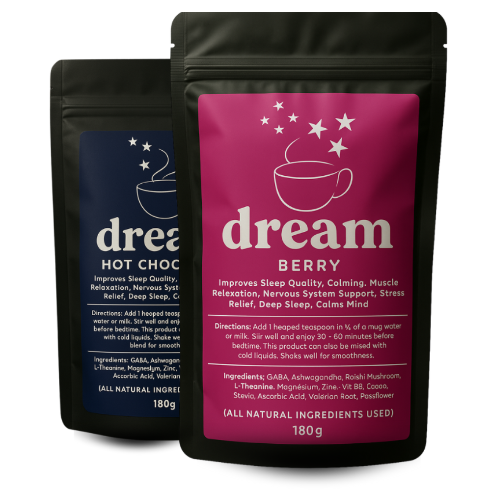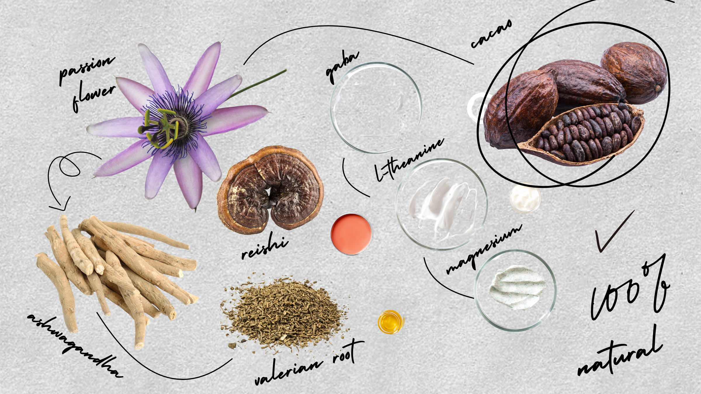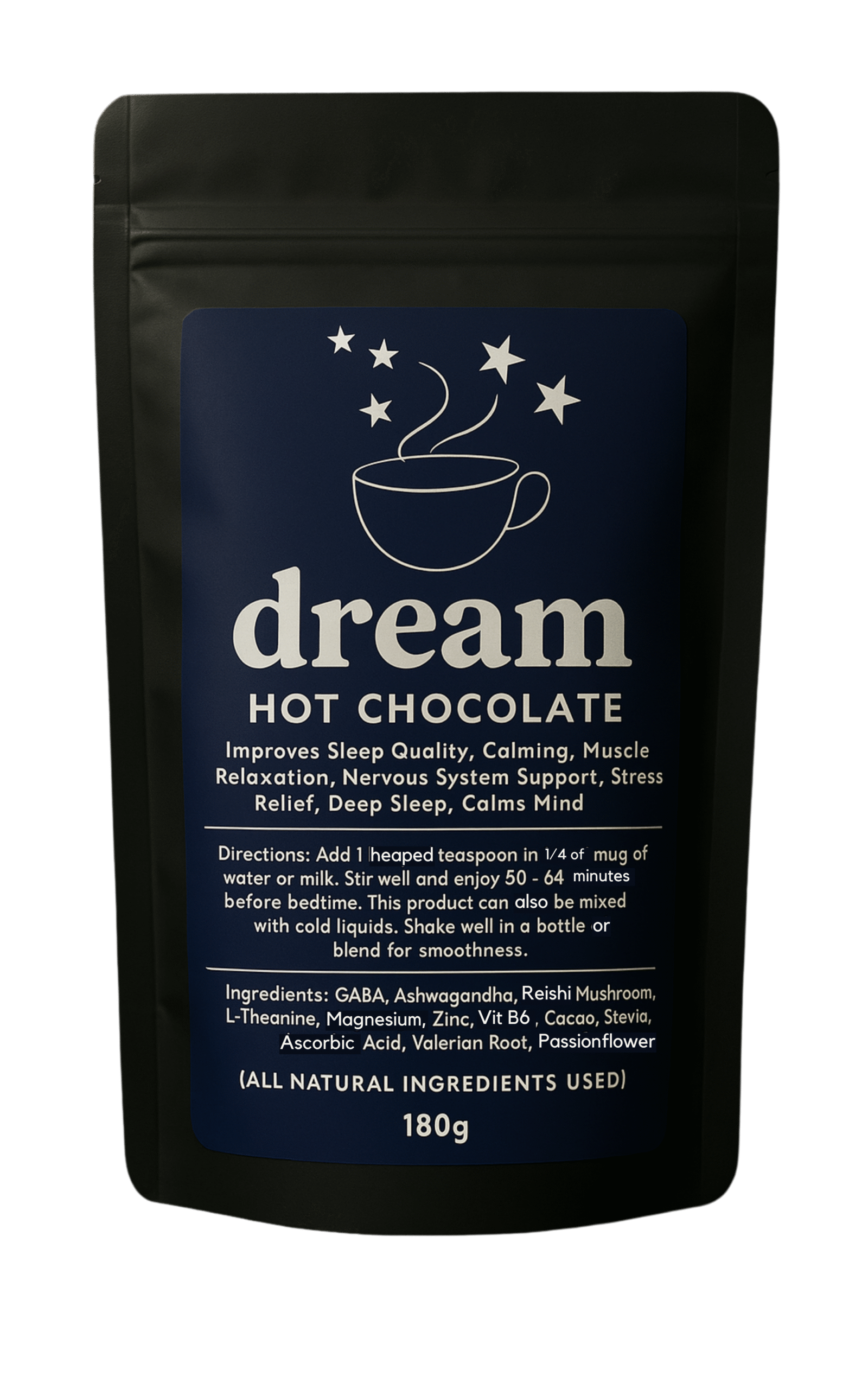 GABA, Ashwagandha, Reishi Mushroom, L-Theanine, Magnesium, Zinc, Vit B6, Cacao, Stevia, Ascorbic Acid, Valerian Root, Passionflower